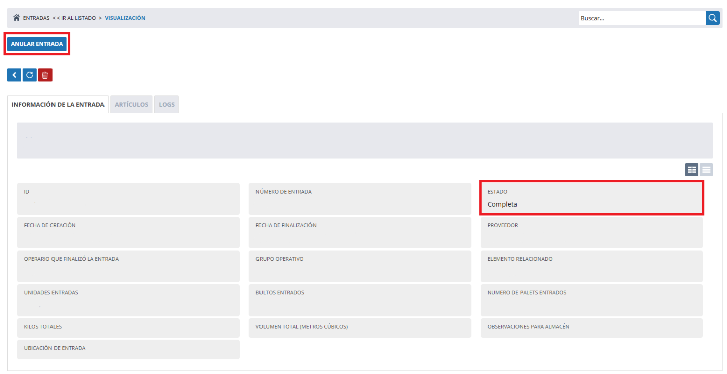 Para anular una entrada, debemos dirigirnos al listado de Entradas, dentro de aquellas entradas completadas, podemos anularlas pulsando sobre el botón ANULAR ENTRADA.