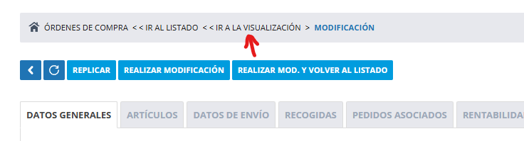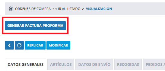 Al pulsar sobre este, no podemos modificar los campos de la orden de compra, pero aparecerá el botón de GENERAR FACTURA PROFORMA: