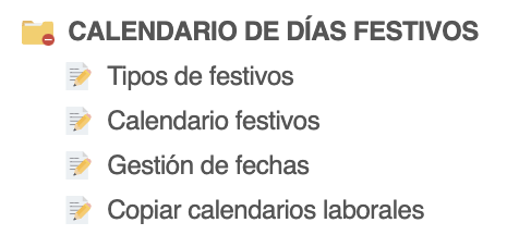 Se pueden definir una serie de calendarios con días festivos para asociarlos a los empleados. Lo más cómodo es crear calendarios de festivos nacionales, por comunidad y provincia.