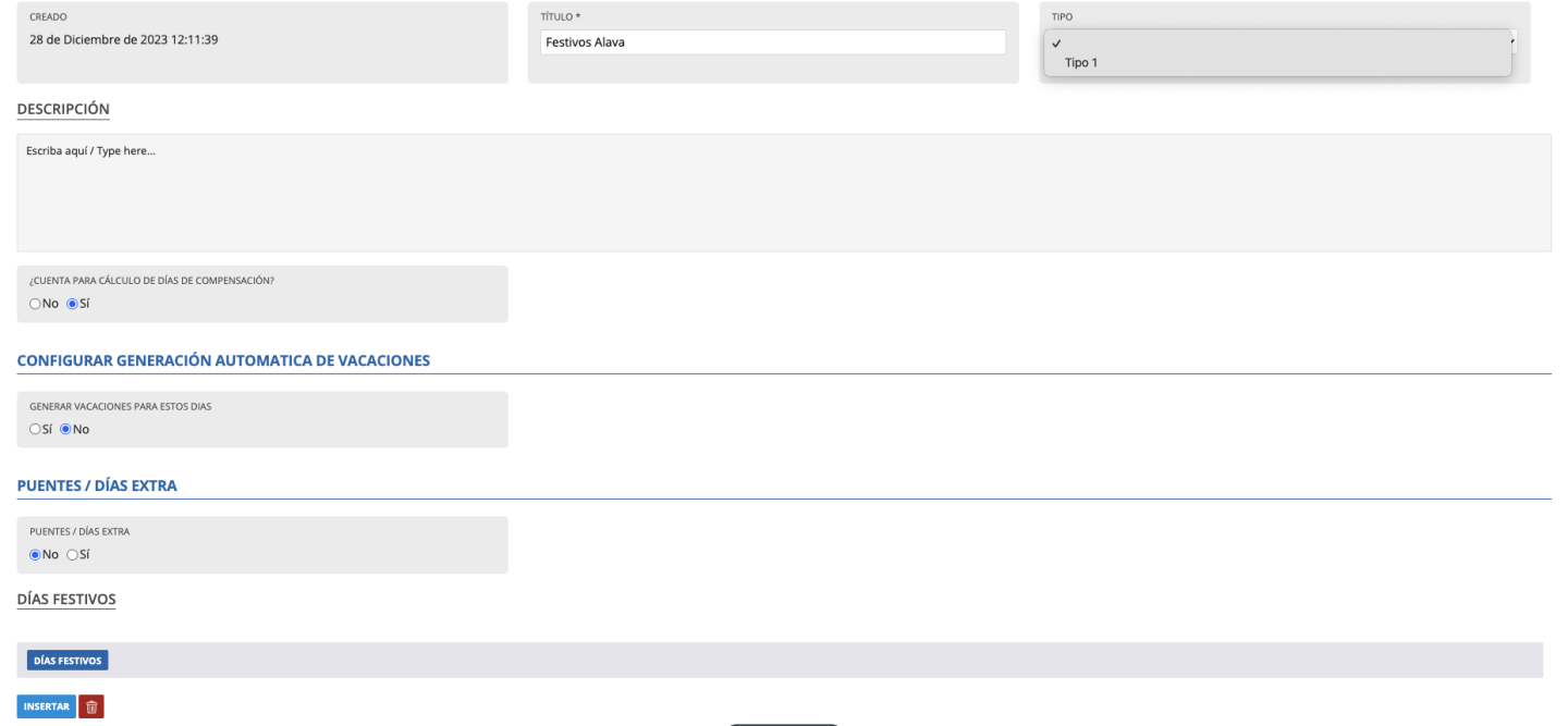- Días Festivos incluidos: Insertaríamos todos los Festivos de la Comunidad Autónoma