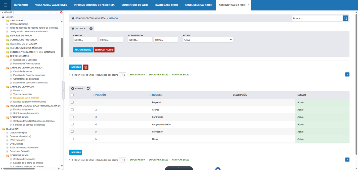 Para configurar el canal de denuncias, accede a ADMINISTRADOR RRHH y, en el índice, despliega la carpeta CANAL DE DENUNCIAS. En la parte inferior encontrarás:
