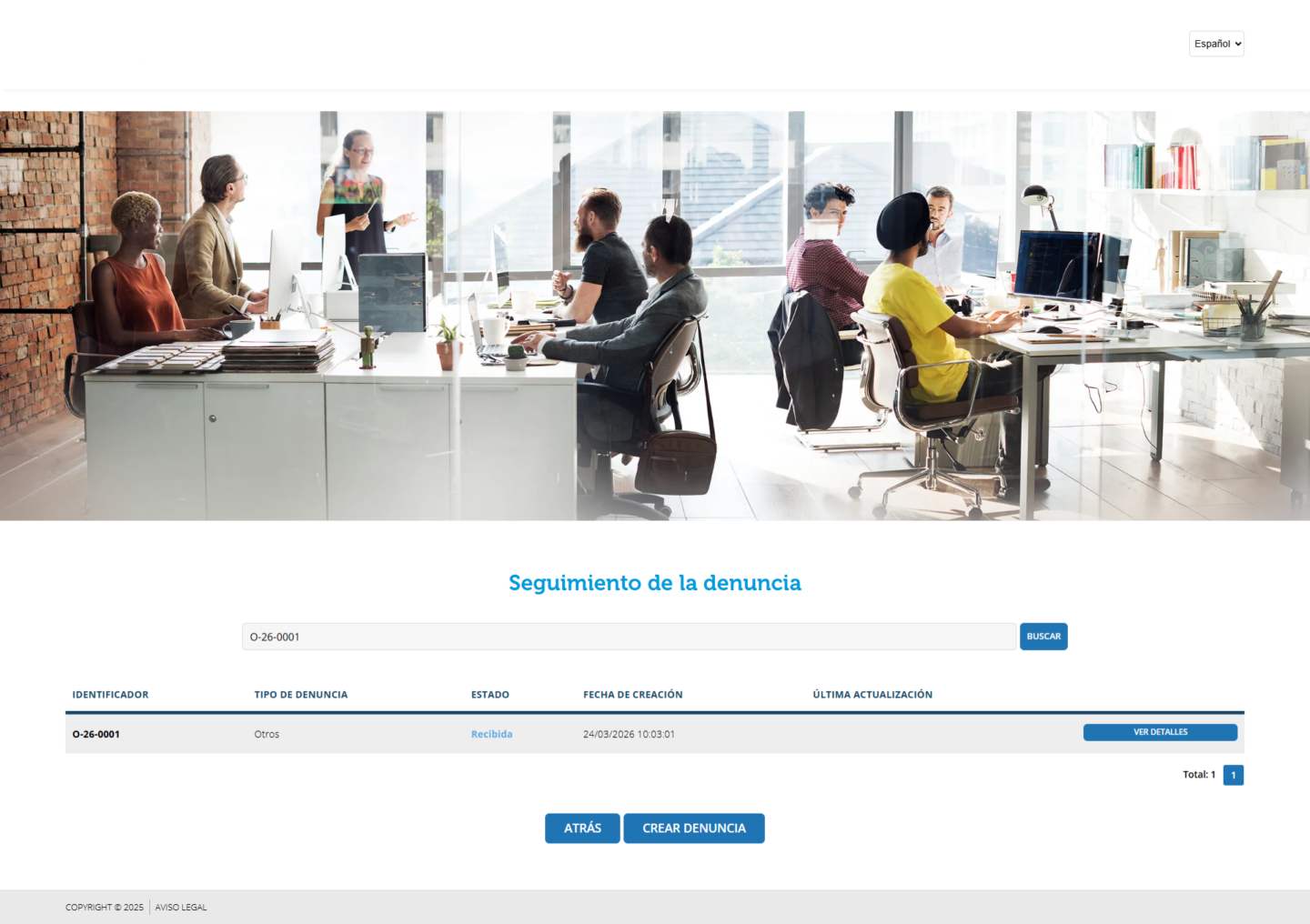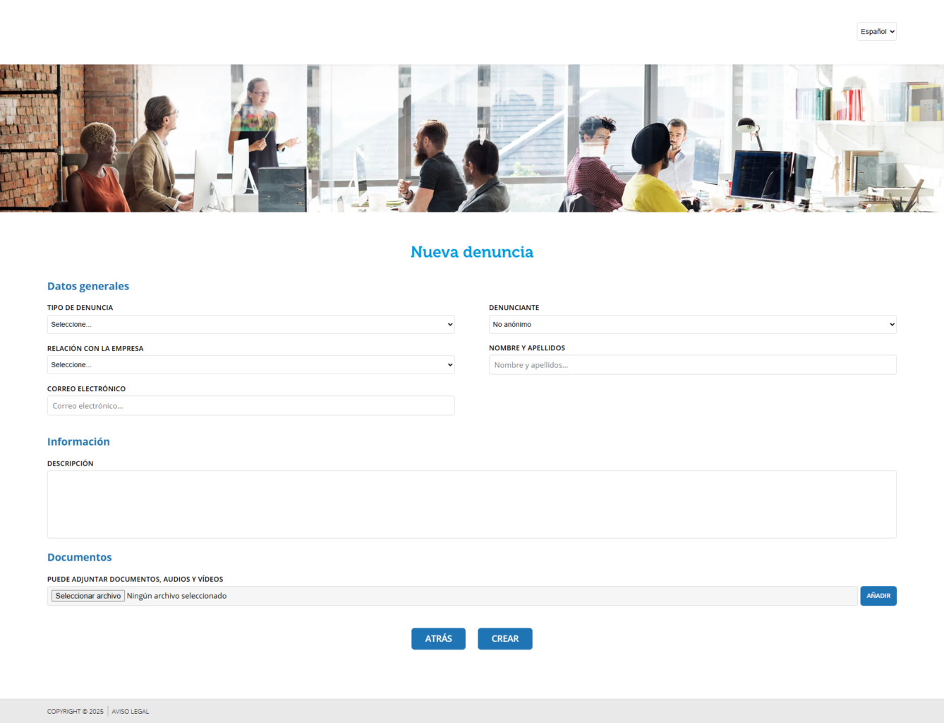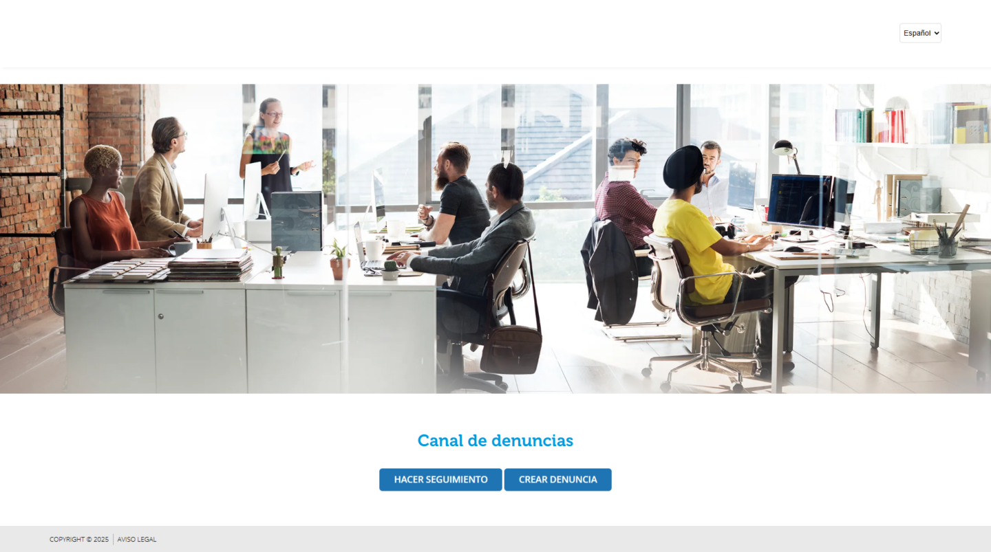 - Crear una denuncia nueva → Permite enviar una denuncia pública siguiendo los campos obligatorios configurados (tipo de denuncia, relación con la empresa, etc.).
