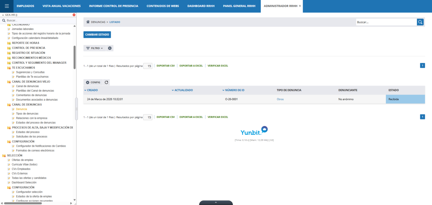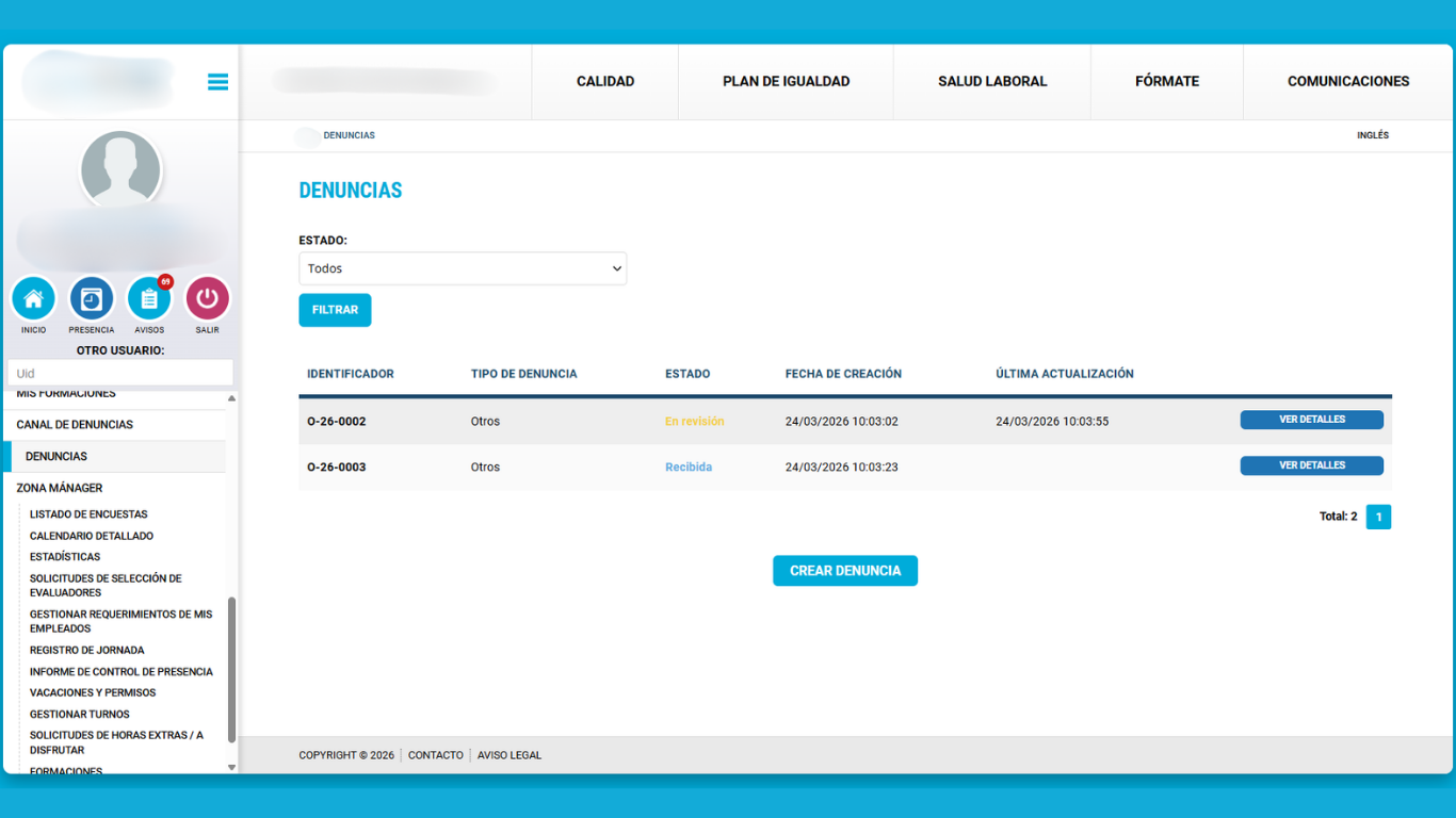 Como en prácticamente todos los módulos del portal, el canal de denuncias interno muestra un listado de nuestras denuncias.