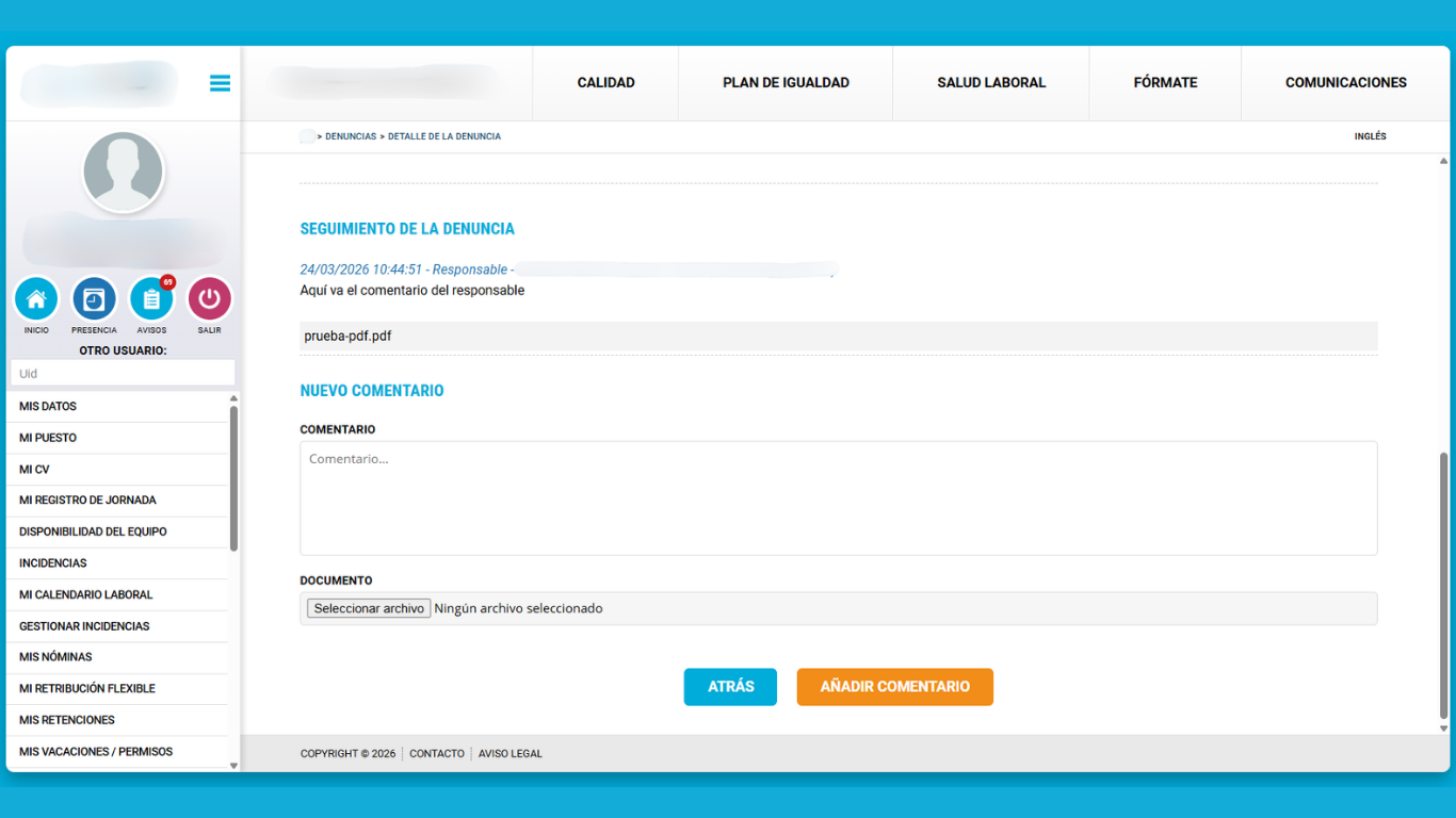 ⚠️ Al igual que en el gestor general, las denuncias no pueden modificarse ni eliminarse, solo visualizarse e insertar comentarios.