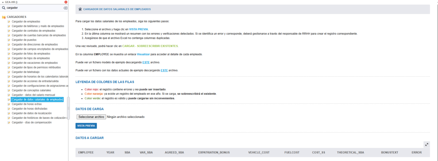 Desde el Administrador de RRHH podemos acceder al cargador de puestos. Desde aquí es posible insertar y actualizar los datos salariales: