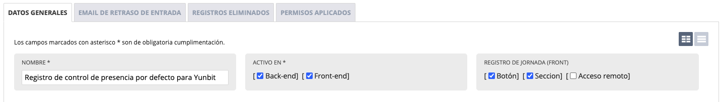 La pestaña permisos en la configuración del registro de control de presencia tiene en cuenta los permisos de la siguiente manera: