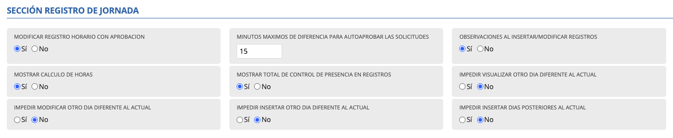 - Sección Registro de Jornada: Configuración aplicable al portal.