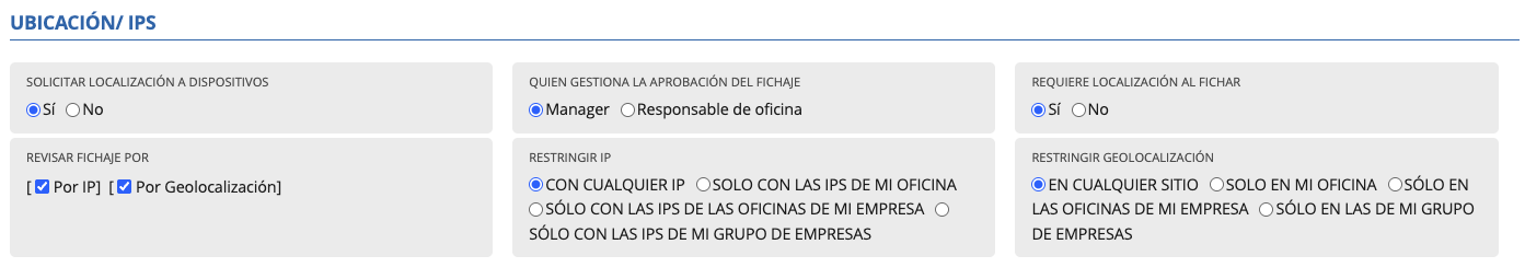 - Ubicación/IPs: Requiere la ubicación al fichar