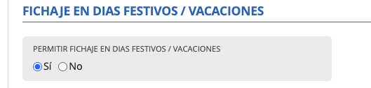 - Fichaje en Días Festivos/Vacaciones: Configuración para permitir o no el fichaje en estos días.