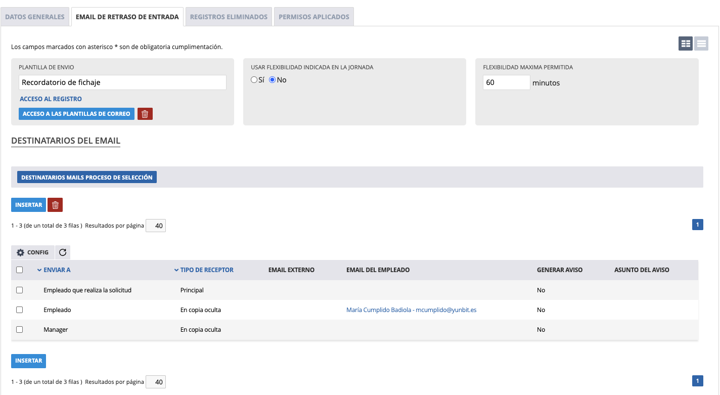 En esta pestaña aparece un listado de registros, si se ha marcado "Eliminar registro de control de presencia si supera"