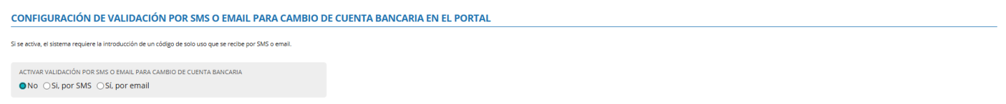 - Activar el campo Activar validación por SMS o email para cambio de cuenta bancaria.