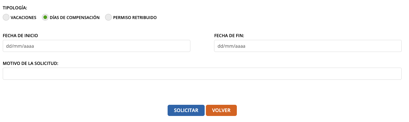 Desde esta sección podremos solicitar vacaciones y permisos rellenando el formulario correspondiente para, y según el caso, para días de: