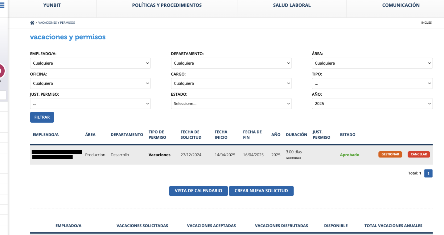 El portal del empleado de Yunbit dispone de varios accesos al calendario: uno para la gestión de solicitudes personales, y otro para la gestión de solicitudes de personas a cargo.