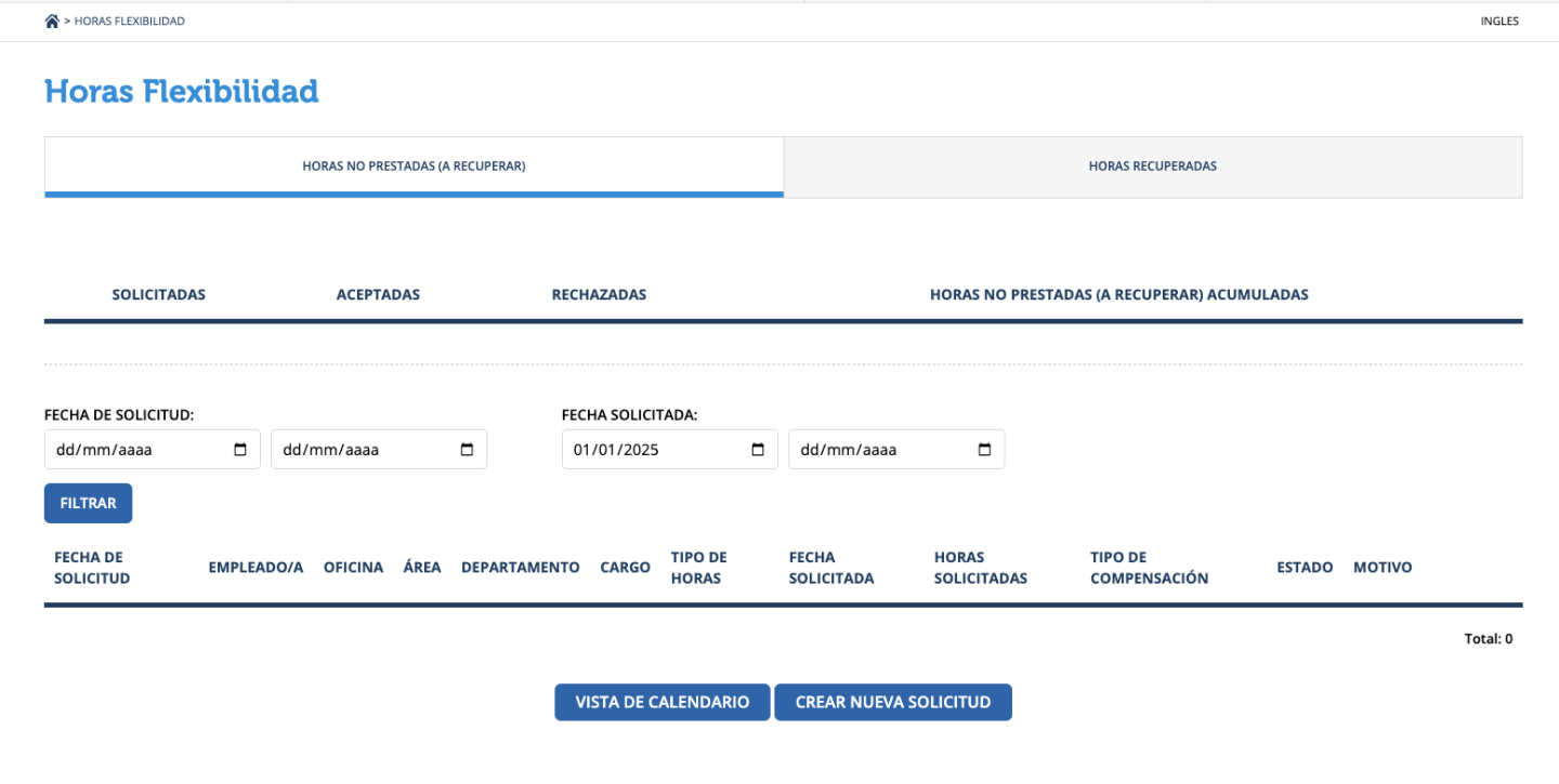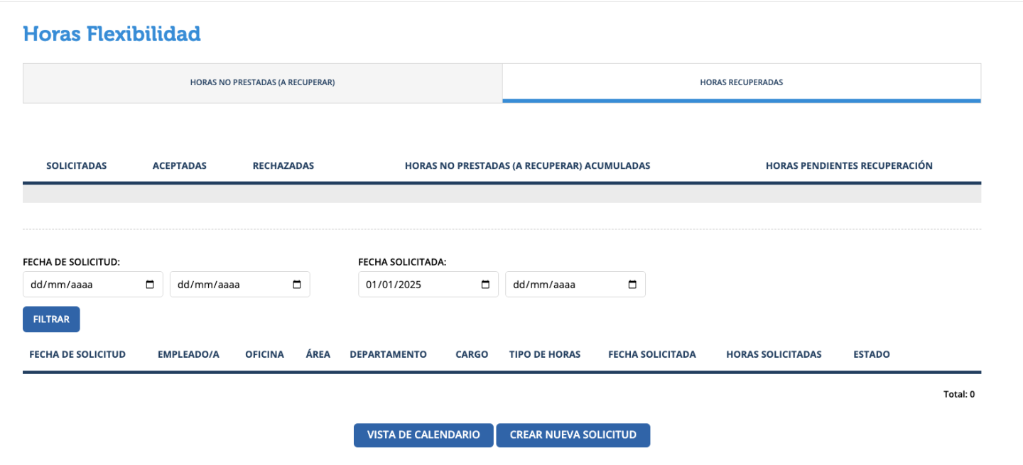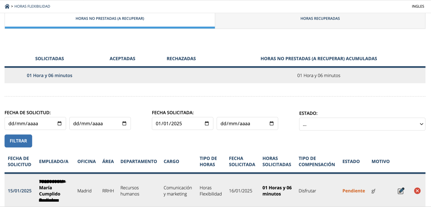 En la segunda pestaña tendremos una visión global de las horas de flexibilidad HORAS RECUPERADAS que hemos solicitado y los estados en los que se encuentran: