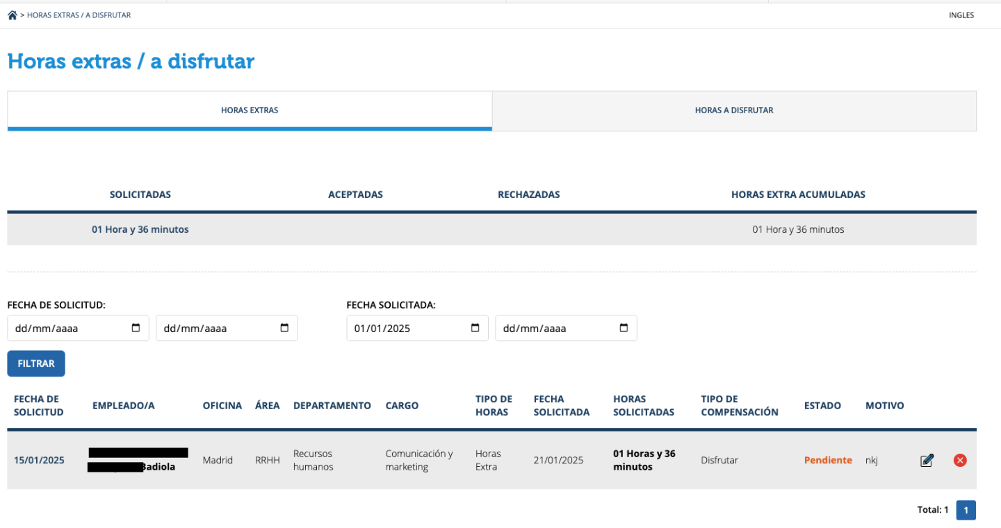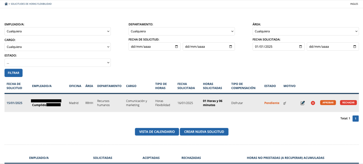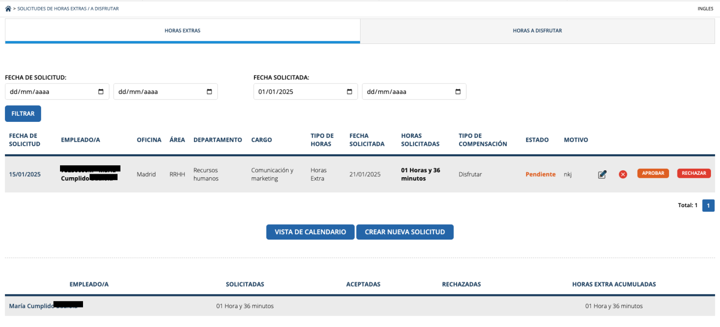 Una vez configuradas las horas extras y horas flexibilidad desde el área de gestión de empleados a cargo podremos gestionar las mismas. Desde esta sección tendremos acceso a una página como la siguiente:
