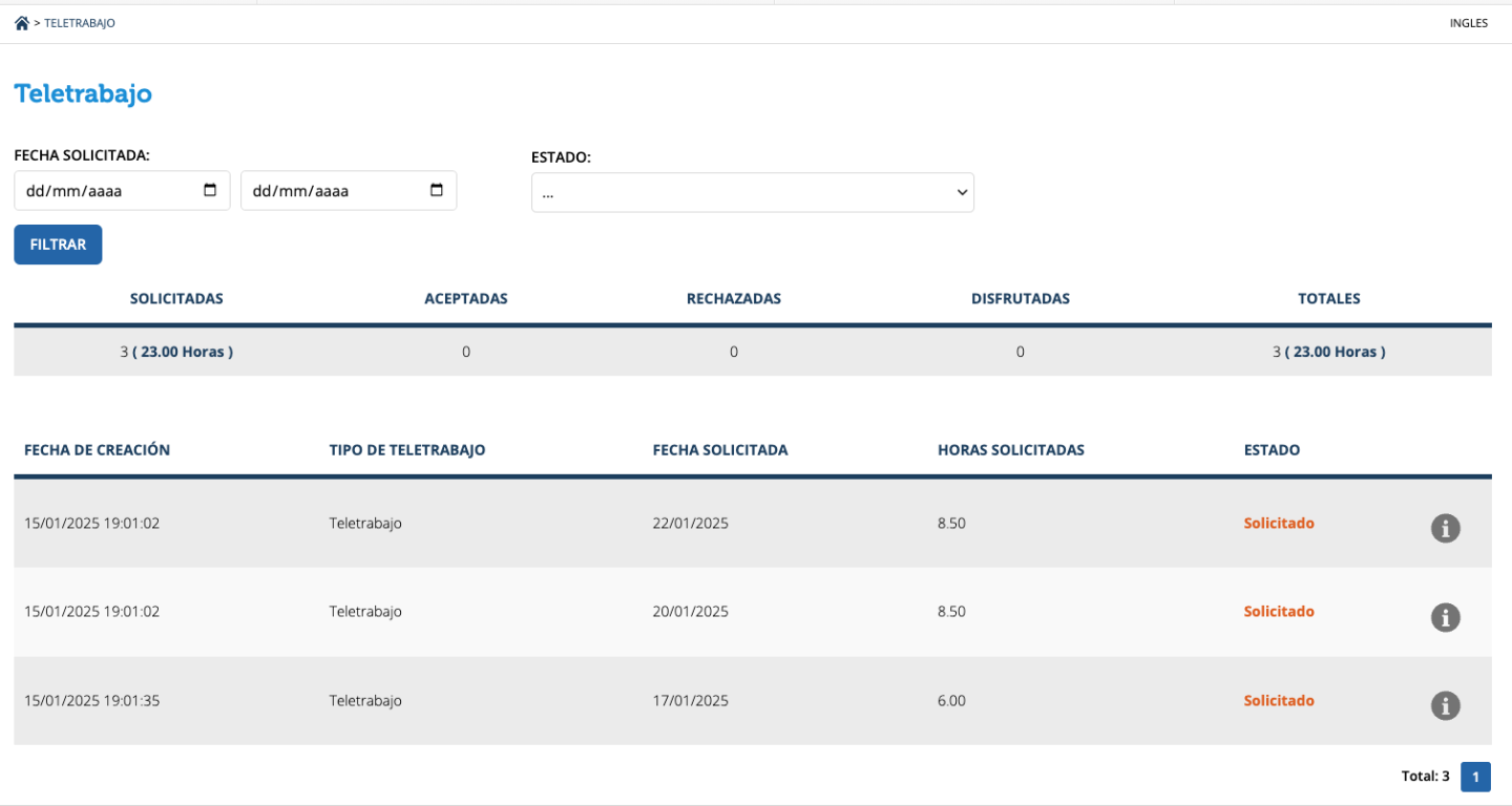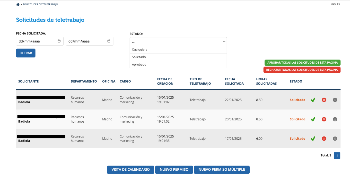 Las solicitudes de teletrabajo de los empleados generan en la sección para el manager un listado con la siguiente información y funcionalidad:
