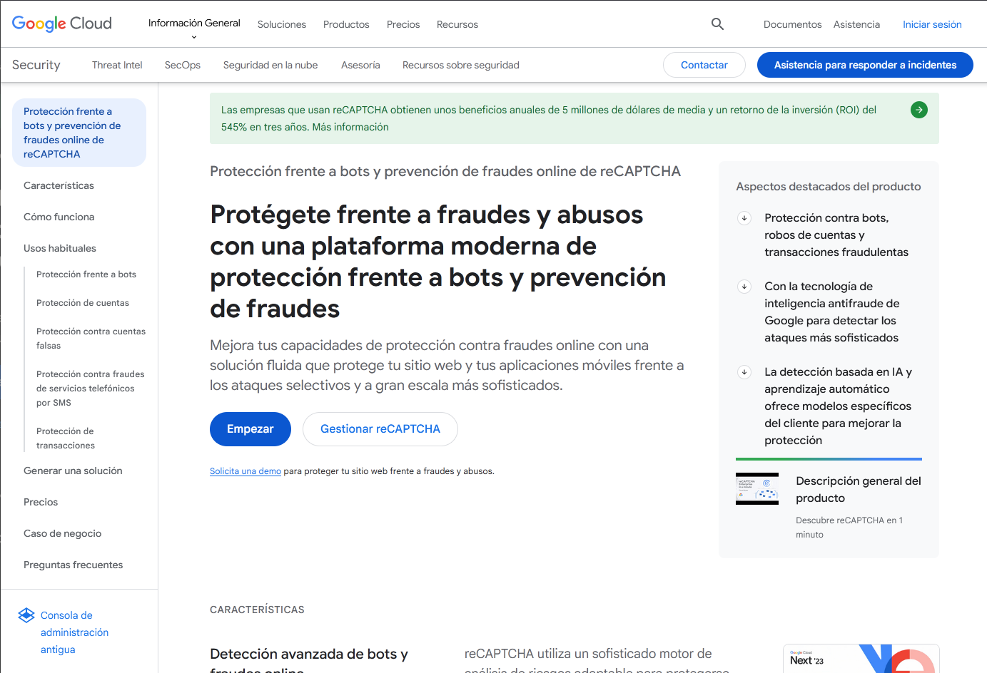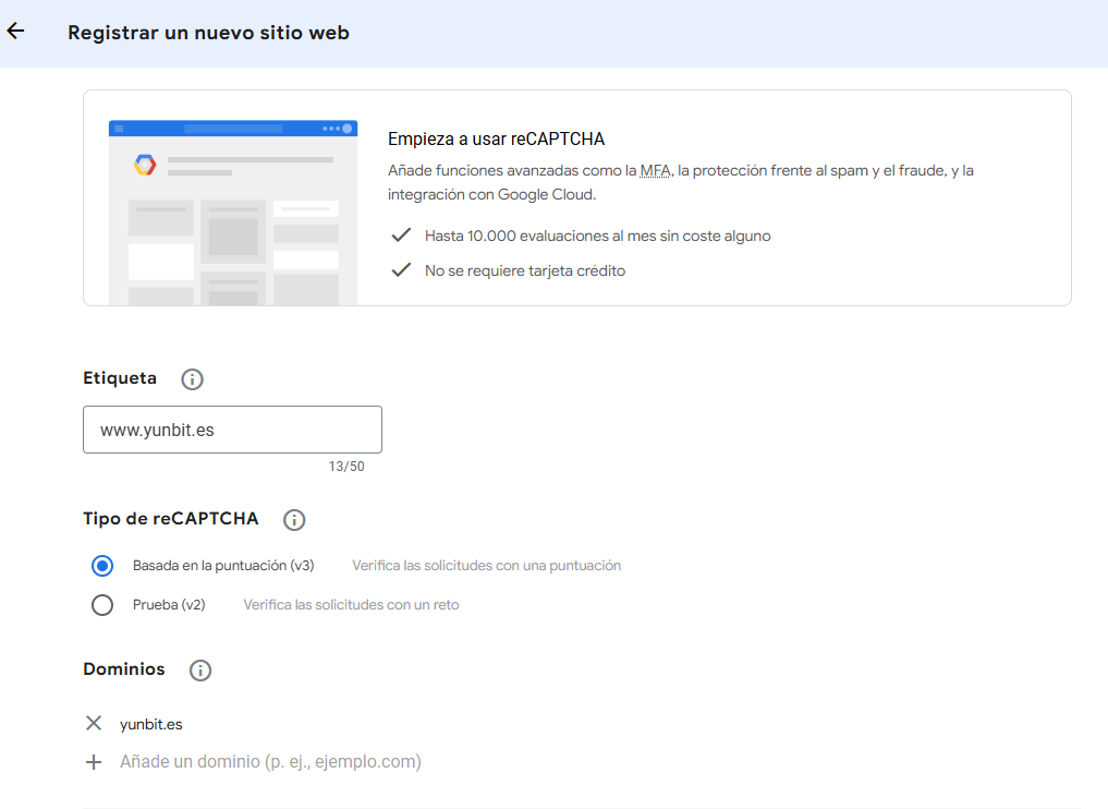 En primer lugar, y para hacer uso de este servicio; a través de la consola de Google Cloud, iremos a la página reCAPTCHA de Google.