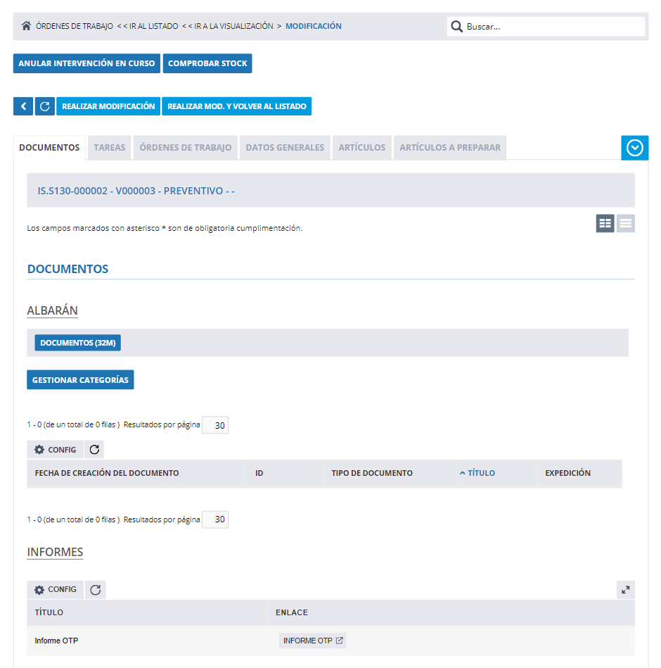 Si hemos seleccionado informes en la Plantilla de intervención al acceder a la Intervención relacionada en la pestaña Documentos encontraremos los informes asociados.