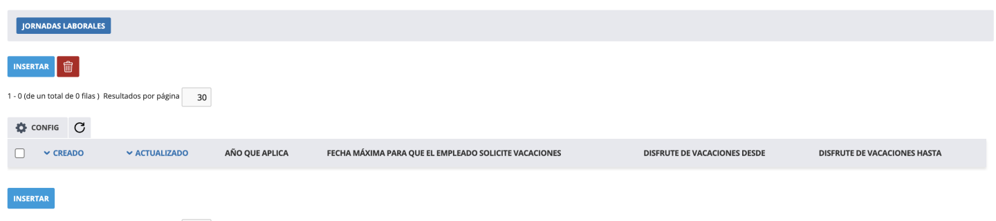 - Fecha límite para vacaciones en otro año, día y mes: si se rellenan, a la hora de solicitar vacaciones con cargo al año anterior tienen que ser anteriores a esa fecha.