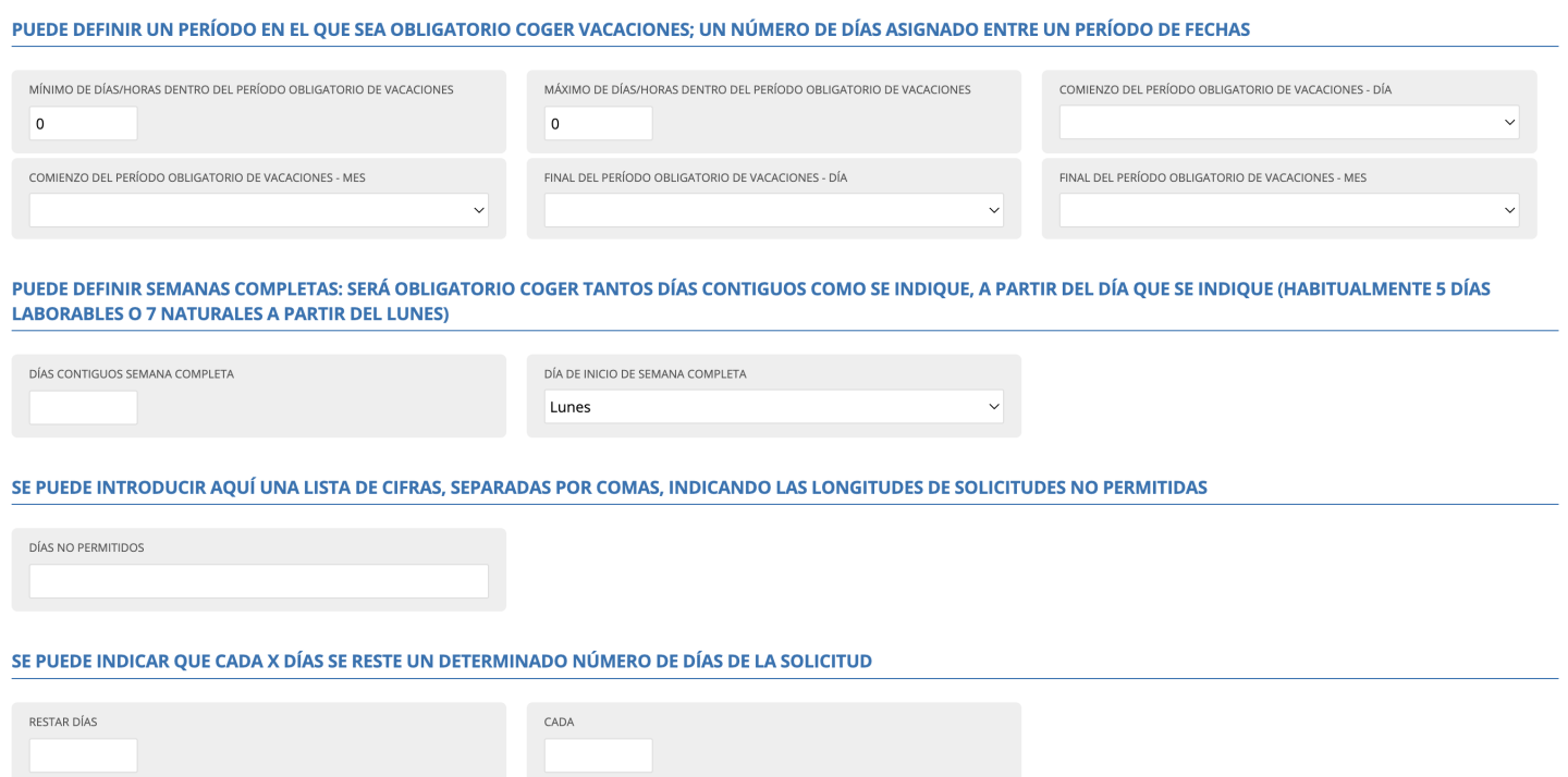 En esta pestaña se pueden definir restricciones a la hora de solicitar vacaciones: