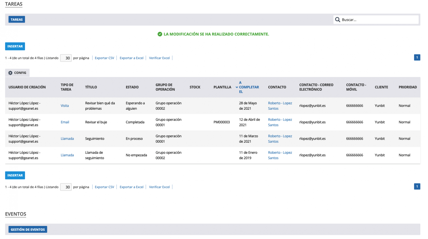 Registro de las tareas y eventos (calendario) asociados a esta empresa a través de sus contactos.