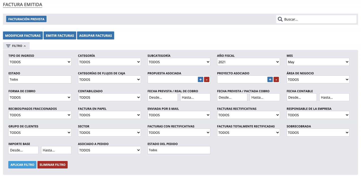 Listado de facturas emitidas asociadas a la empresa, buscador y filtros:
