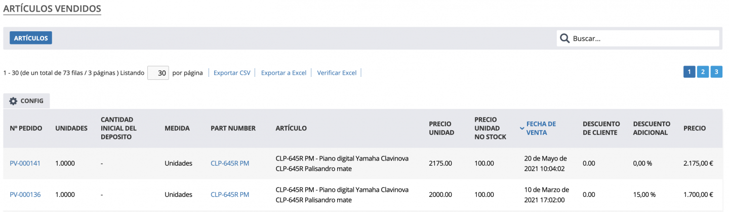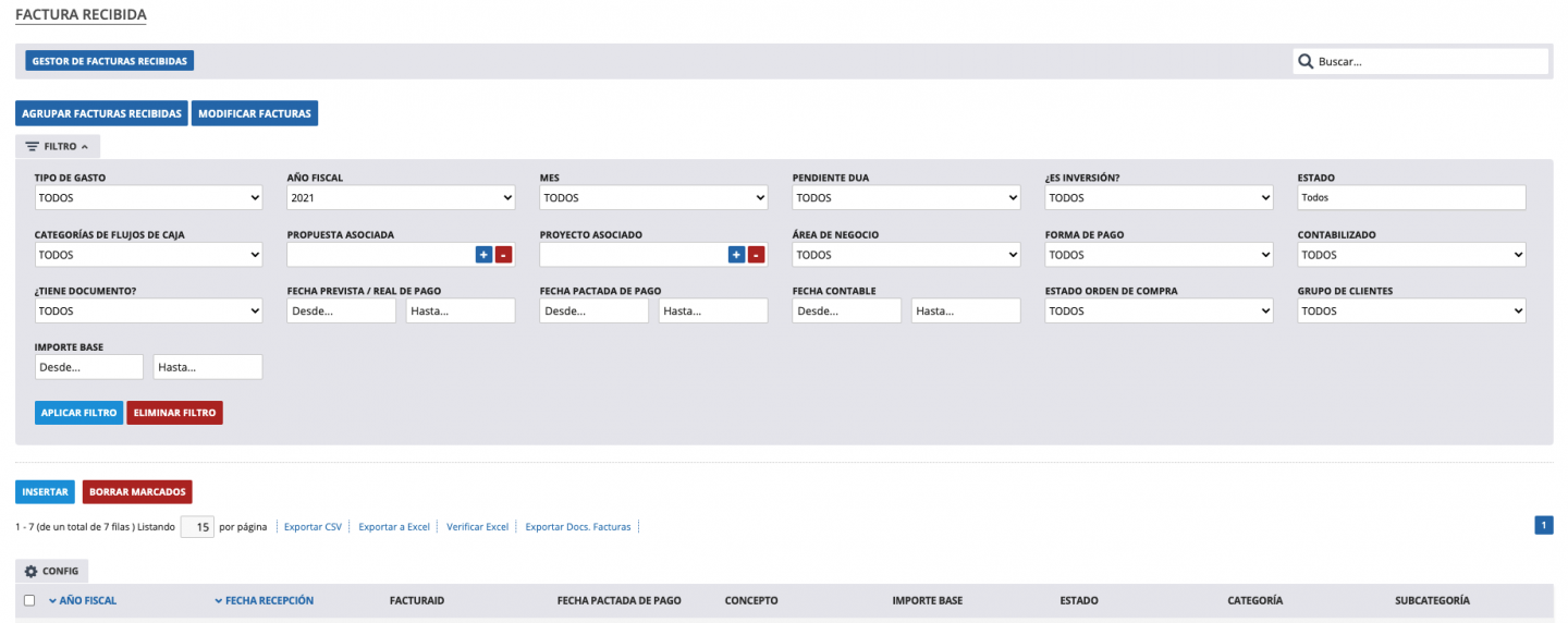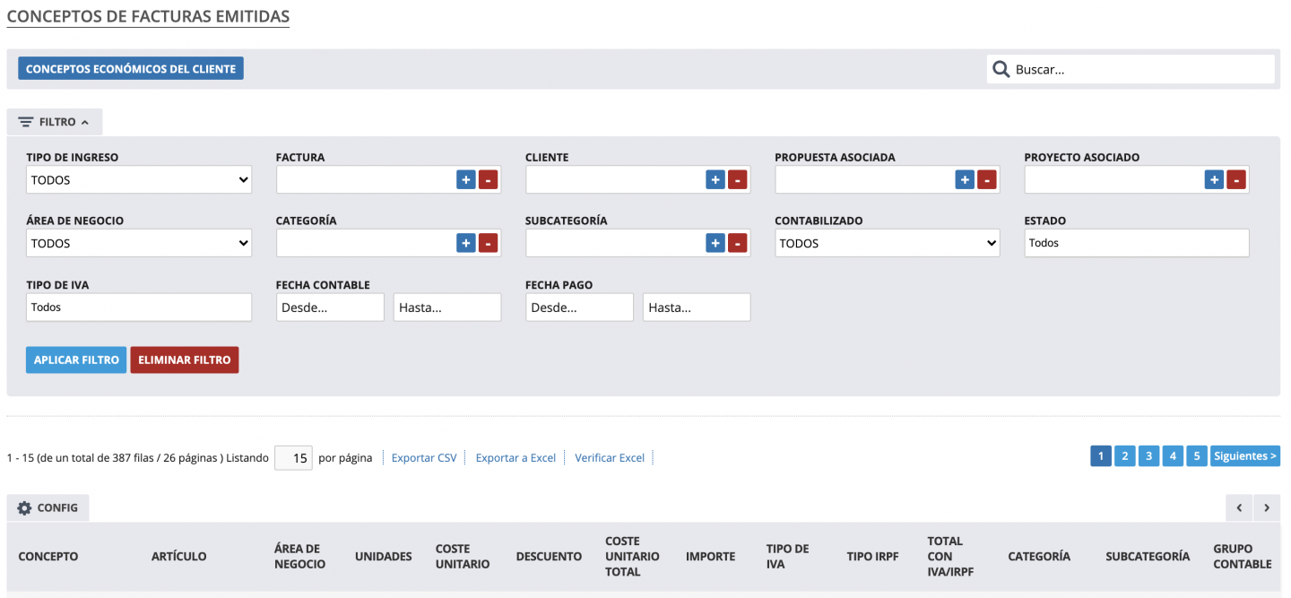 Listado de conceptos de facturas emitidas, buscador y filtros: