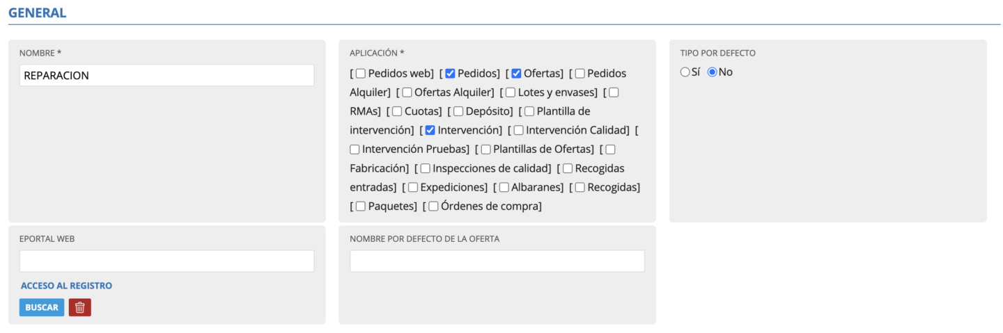 La intervención es un tipo de pedido en el que influyen las aplicaciones de pedidos, ofertas y las plantillas intervención. Podemos configurar el tipo de pedido según el caso, a configuración se muestra la ficha de Tipo de pedido; toda la explicación de su funcionalidad en: Configurar tipos de ofertas y pedidos, planificación de intervenciones e intervenciones