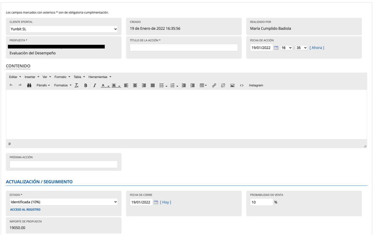 - En esta sección podremos ver la actividad comercial y siguientes pasos programados haciendo click en "Insertar" y cumplimentando el gestor correspondiente: