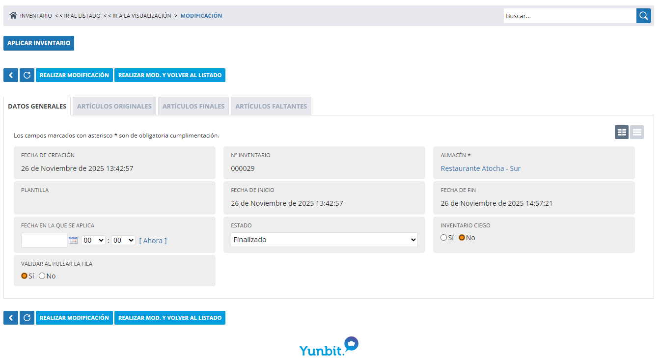 - Almacén: Nos muestra el almacén desde el que hemos hecho click en el botón Nuevo inventario.