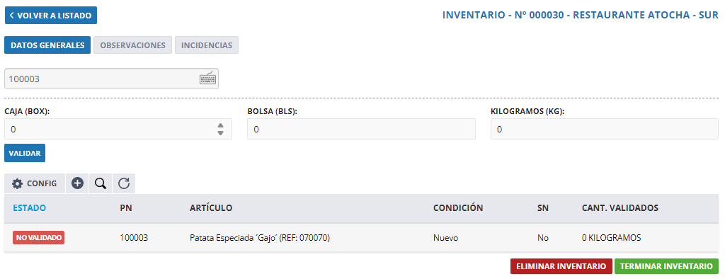 - Desde el gestor de Órdenes de Trabajo, pinchamos en la orden de trabajo creada y podremos ir picando ubicaciones (si las tenemos activadas) y artículos o contenedores, de este modo, el sistema los irá detectando y guardando para que una vez finalizada la orden de trabajo y la cerremos, estos artículos picados sustituirán el stock actual y el resto que no haya sido picado serán los artículos que se marquen como no disponibles y su stock será 0.