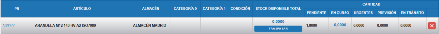 IMPORTANTE: Si hacemos rollover sobre el número, aparece cantidad y al almacén en el que se encuentra el stock. - TRASPASAR: Nos abre la ventana para generar un nuevo traspaso si es que queremos solventar esta rotura de stock con u traspaso en vez de con una Orden de compra.