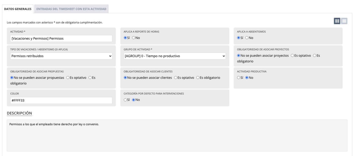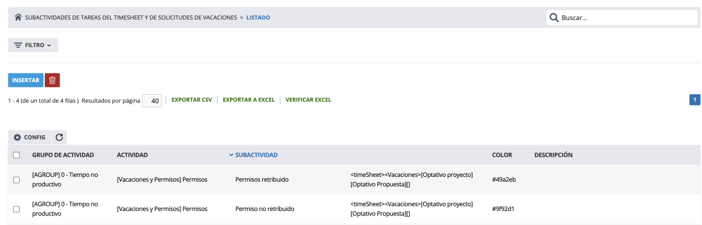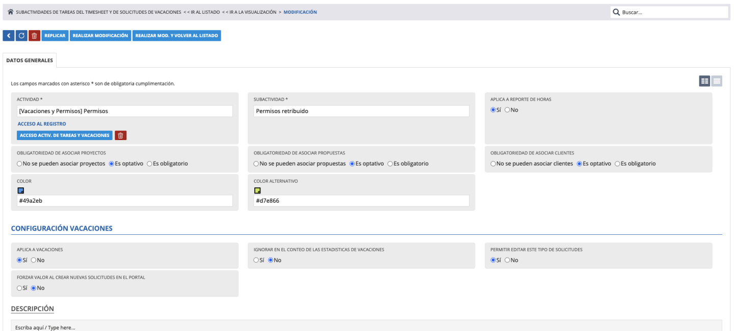 Para favorecer un mayor desglose en los informes de los permisos podemos categorizar estos tipos de permisos accediendo a los gestores de actividad y subactividad de tareas y vacaciones: