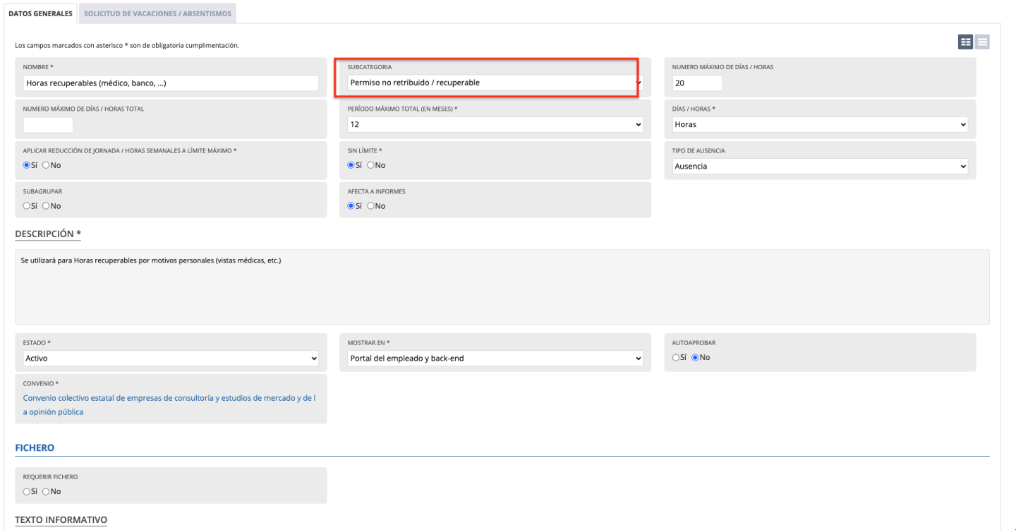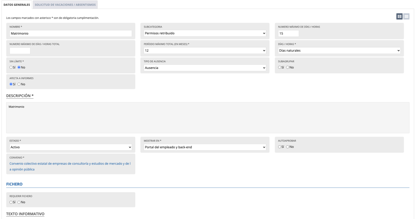 - Requiere fichero: indicamos que sí, para que suba el documento que justifica este permiso.