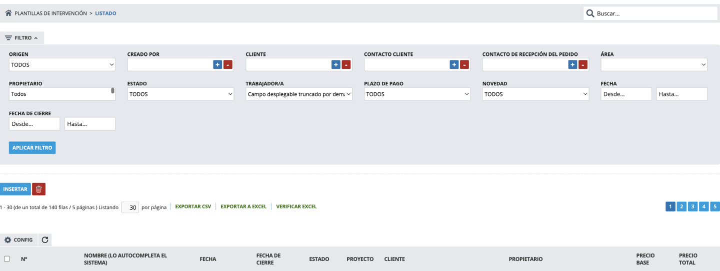 Listado de plantillas de intervenciones
