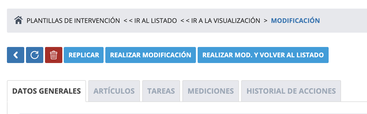 Una plantilla de intervención es una versión simplificada de las órdenes de trabajo de tipo intervención a la que podemos asignar artículos, servicios, tareas, mediciones, grupos operativos, etc... Así, cuando generemos una OT intervención desde el listado de planificación de las intervenciones, partiendo de esta, se heredará todas sus configuraciones.
