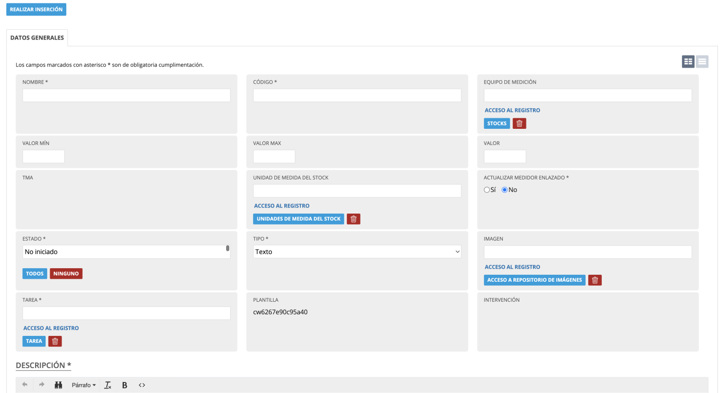 Mediante el botón "Insertar" podremos crear las plantillas que deseemos. La ficha de la plantilla dispone de los siguientes campos: