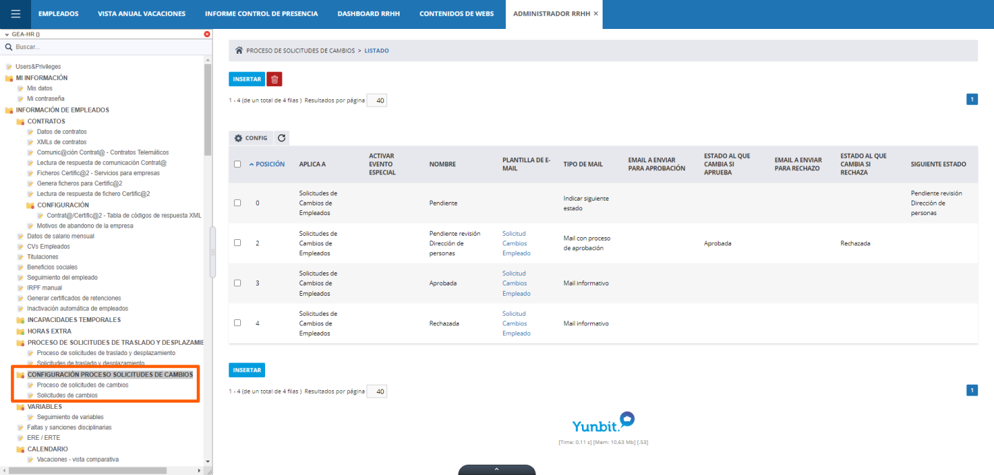 Este proceso requiere la definición de estados para controlar el flujo de la solicitud. Los estados pueden configurarse desde el gestor "Proceso de Solicitudes de Cambios", accesible a través de la ruta: ADMINISTRADOR RRHH > INFORMACIÓN DE EMPLEADOS > CONFIGURACIÓN PROCESO SOLICITUDES DE CAMBIOS.