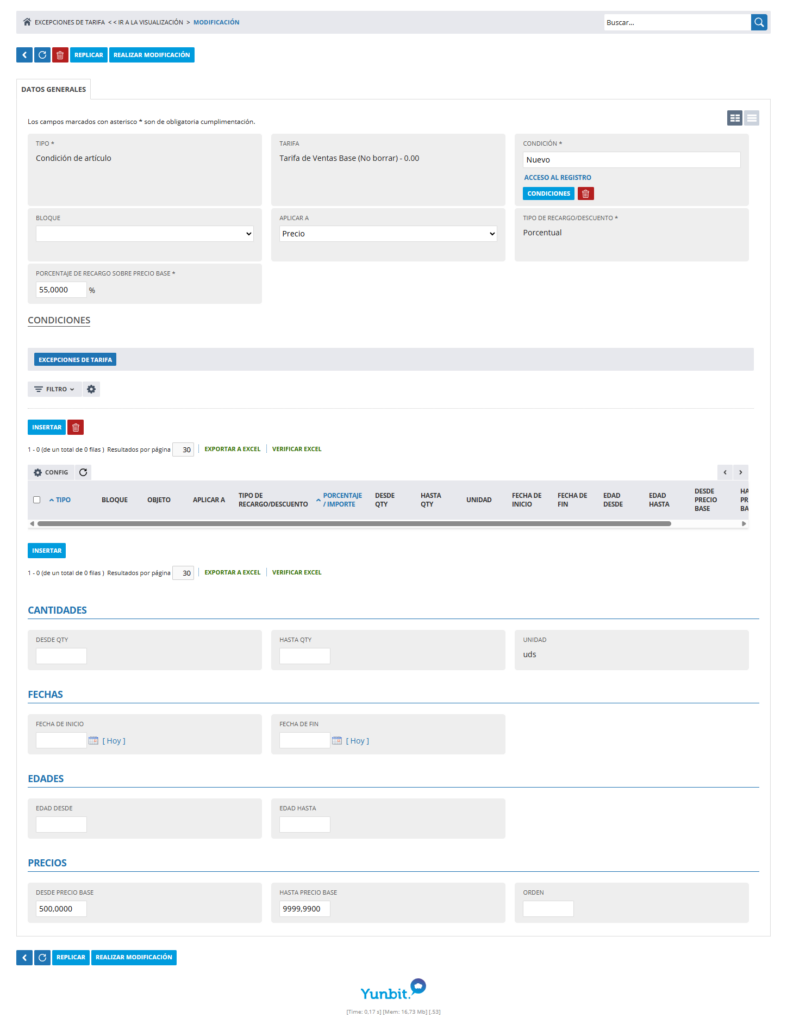 - Fechas: Fechas entre las que tiene validez esta excepción de tarifa.